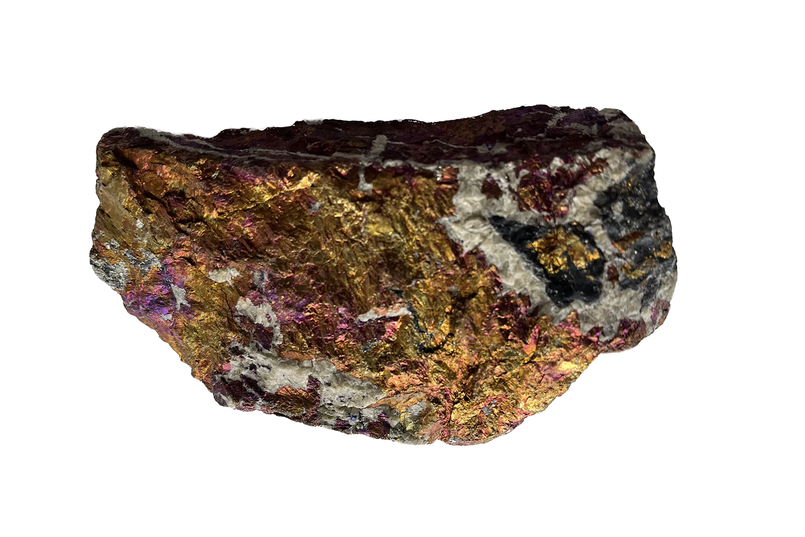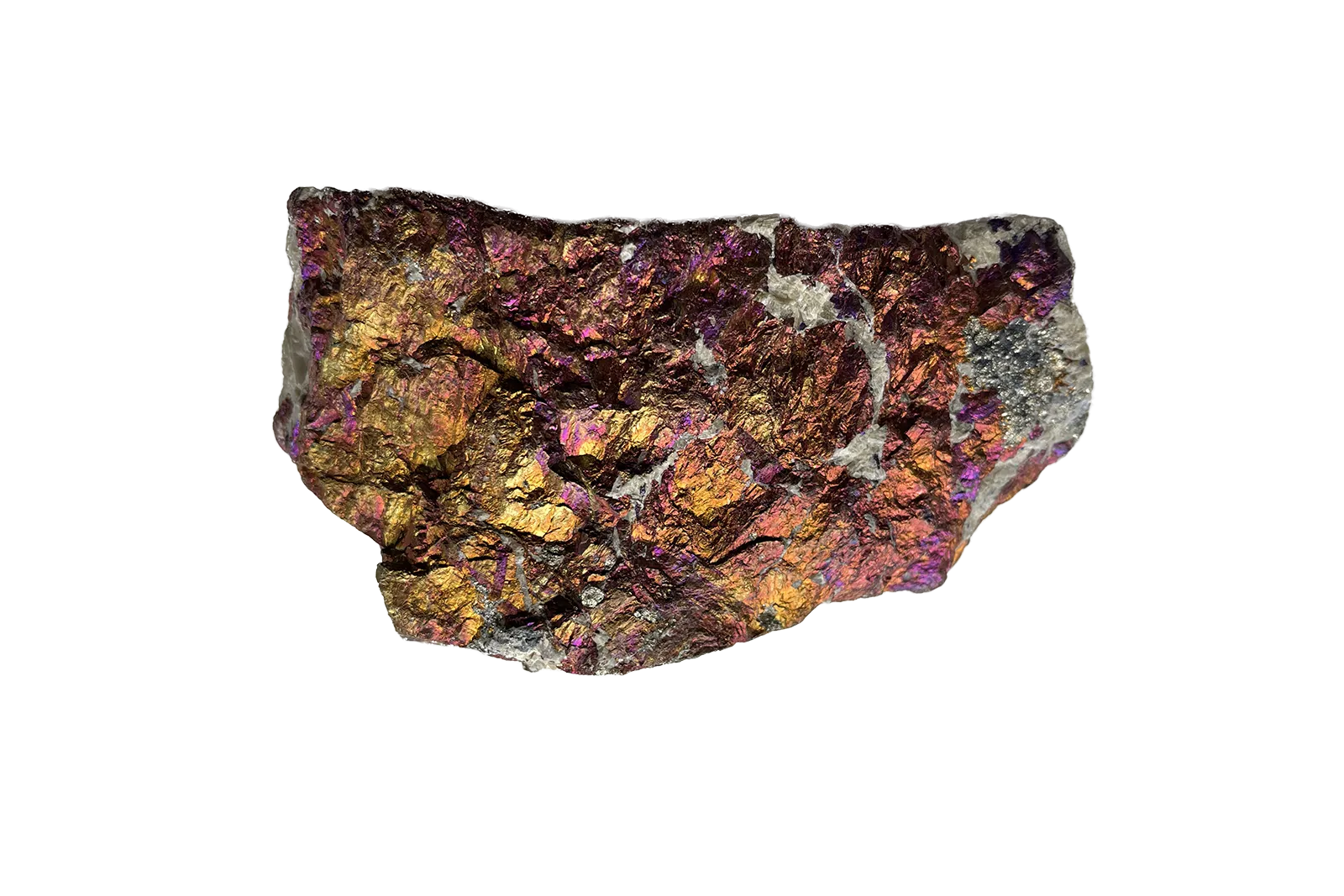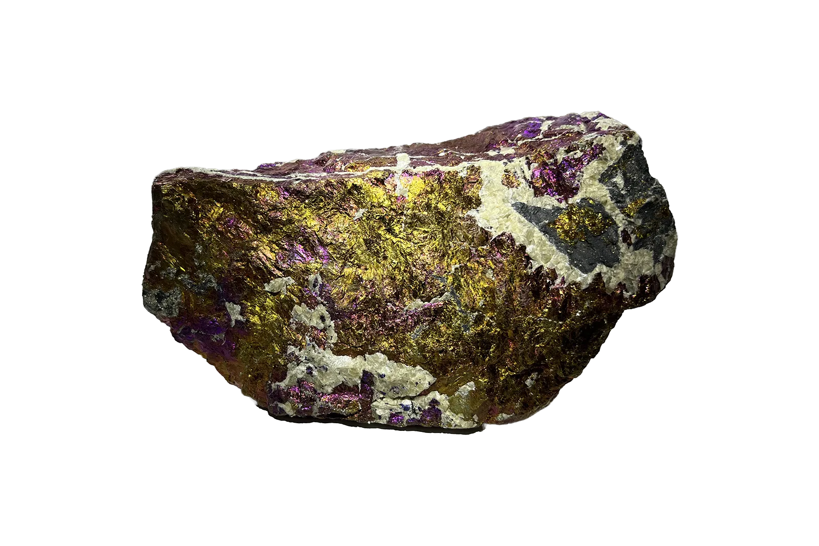 Within this Chalcopyrite specimen, a faint visage emerges — a gilded apparition suspended in violet and gold. The Gilded Apparition captures the surreal fusion of mineral geometry and human imagination, where oxidation paints its own portrait across a metallic surface. Hints of purple and ember-gold shimmer through the rough texture, giving the illusion of consciousness frozen in stone — a fleeting spark of creation in mineral form.